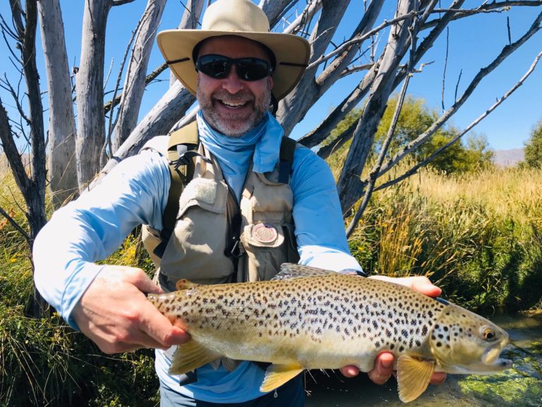 fish per kilometre, which is considered high in New Zealand. The Madison River in Montana is considered a blue ribbon fishery and it has 2000 to 3000 fish per mile. In New Zealand, if you are the first one at a fishing spot, you leave a note on your car to indicate if you went upstream or downstream. No more than two cars per pullout. We passed Lake Tekapo, turned off the highway towards Mount Dobson ski resort and after a few turns arrived at an access spot on the Opuha River, but there was already a car there. There was no note indicating if the angler had gone upstream or downstream. Not knowing, we left. We took the road towards the Mount Fox ski area and found a suitable place to park. We walked about 3.5 kilometers up river. I caught two brown trout, and Rick caught about five trout (four browns and one rainbow). Unfortunately, the rainbow shook the hook out of its mouth right as Dean was getting ready to net it. The fish was tired and Dean tried to scoop it up in the net, but it swam into deeper water, just out of reach. The Opuha river was quite small, but the fish were relatively large. I caught mine on dry flies. Rick caught his on nymphs with a wool indicator. New Zealand fishers have a particular type of nymphing indicator they use. Rick and I liked it. We are converts and bought some of the kits to bring back to Canada. It doesn’t put a kink in the line, can be adjusted up and down the leader, and is easy to cast. Rick and I were rusty because neither of us had fished in months. We quickly learned that you have to have very accurate casts. An angler gets very few casts per fish, sometimes only one. There was some wind, and we felt the pressure. In New Zealand they also use very long leaders – 12 feet – and then they add tippet to that. I rose about five fish that I missed before I caught my first one. Dean was also teaching us how to play larger trout – side pressure, rod low, stay below the fish and let them run. For the ‘stay below them part’, I even had to run my first fish downstream to keep it hooked.
