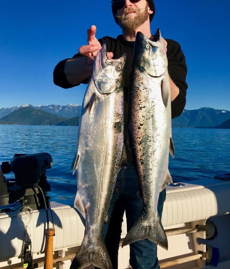 Jason’s guest Paul holding up two nice chinook from Sunday taken in the flat calm waters of Howe Sound.