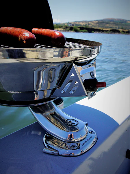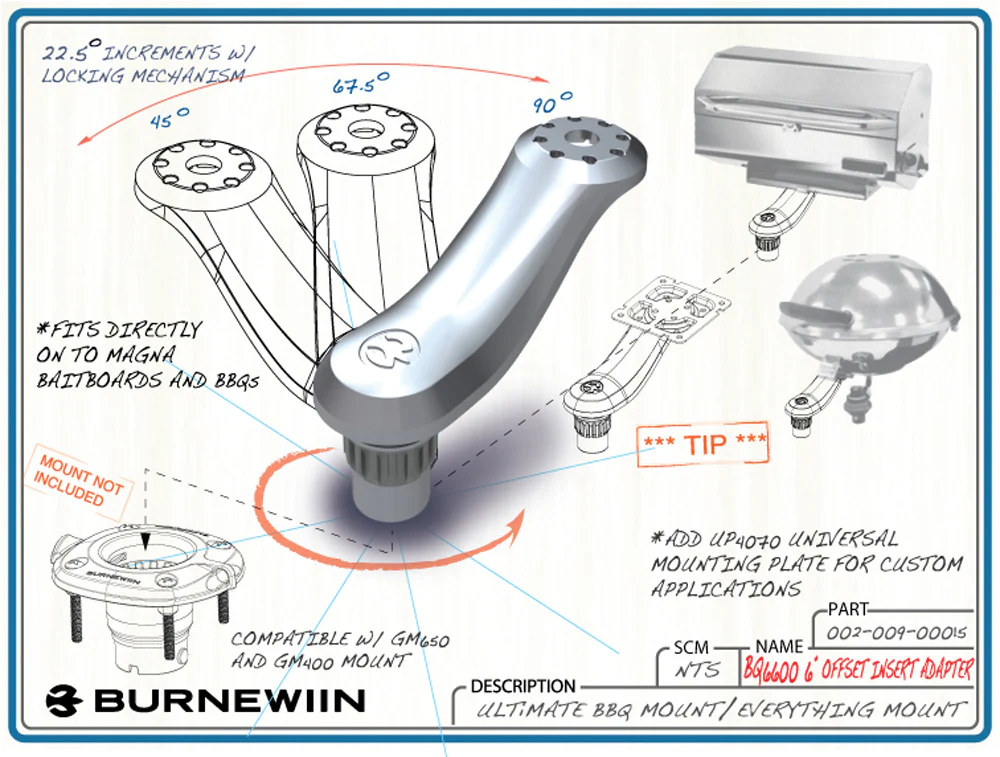 The BQ6600 is one of our line of universal adapters that allow you to mount other manufacturer's products or your own custom creation into Burnewiin Mounts. The BQ6600 is particularly useful for Magma (TM) brand BBQs and bait boards. Customers have mounted many different types of BBQs to the BQ6600 using custom adapter plates. The BQ6600 creates a 6" (150mm) horizontal and 2.75" (70mm) vertical offset of the attached boating accessory and can be attached to the accessory in a 45-degree manner to a create a forward or aft positioning of the boating product accessory. It is an incredibly useful adapter and is a visual work of art. If you have never wanted a BBQ on your boat because of mounting concerns, then be sure to have a close look at this Burnewiin boating product. Some customers also install a Burnewiin mount in a storage hold to securely store the BBQ in that mount when not in use on deck.