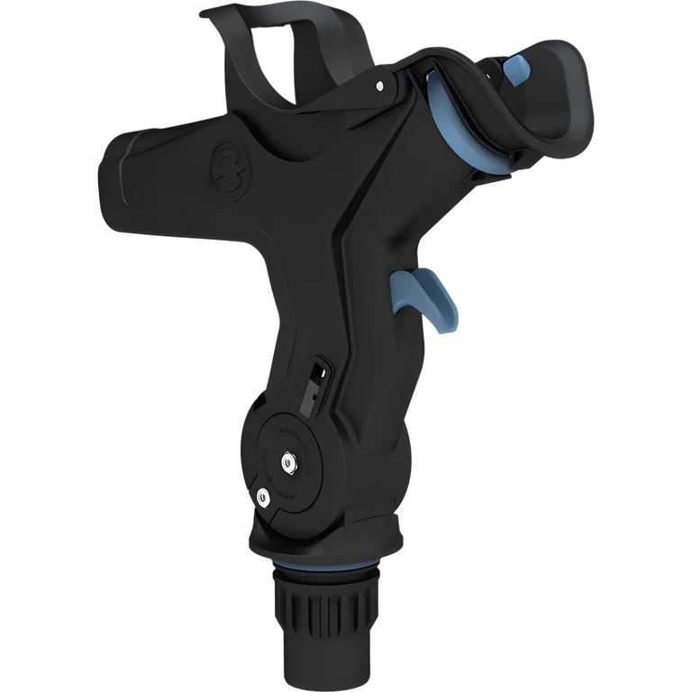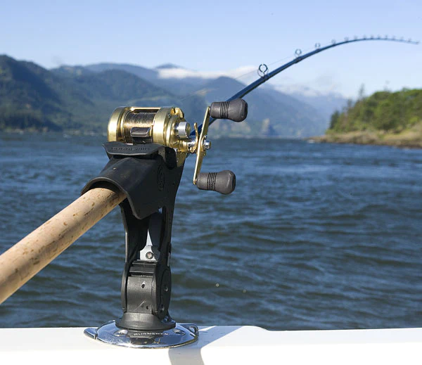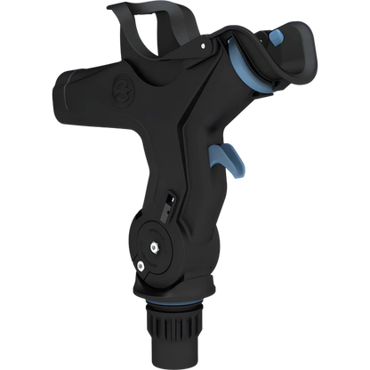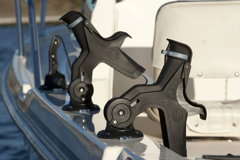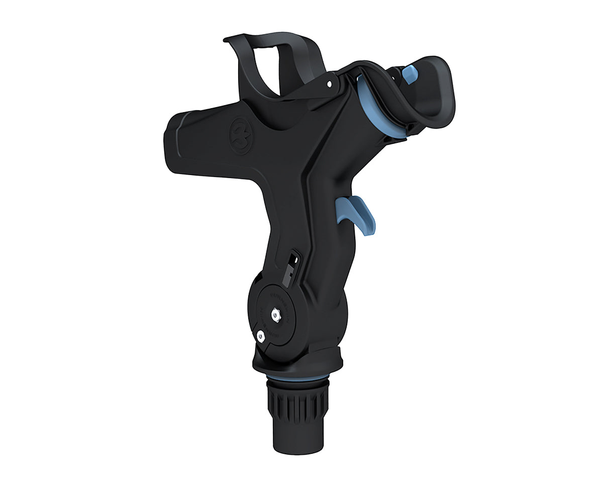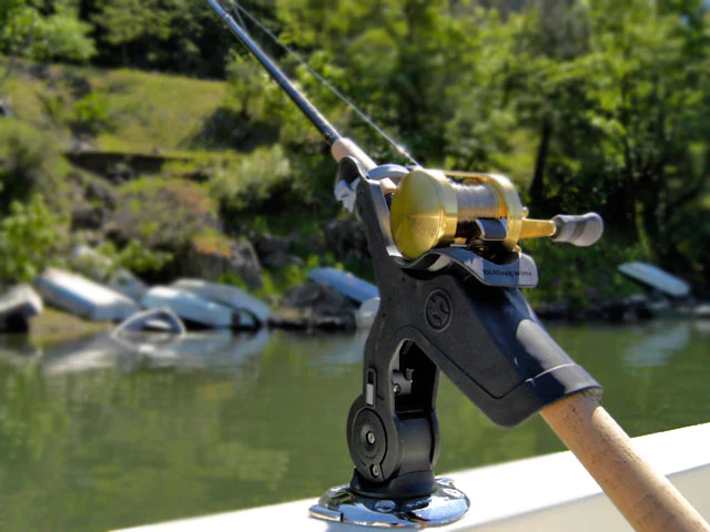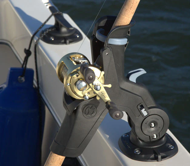 The RH5710 Rod Holder design is dedicated to top mounted bait casting rod/reel combinations. The reel stabilizer, self-adjusts to the particular rod reel combination. The flush mounted rod holder can be horizontally rotated in 22.5-degree increments in the mount and the rapid adjust trigger allows four vertical fishing positions (0, 25, 50 and 75 degrees). Rod removal is quick and clean in any position. The RH5710 can be quickly rotated to a vertical position to create a rod storage location when idle or running. The RH5710 also includes a simple, secure rotary rod lock.It is compatible with the GM400 and GM650 boating Mounts.