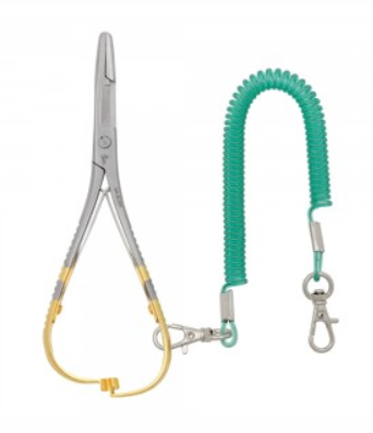 Same basic concept as the mitten clamps, but with a serrated scissor mounted behind the jaws. This addition allows for cutting tippet/leader material, trimming flies streamside or opening that pesky bag of jerky. Comes spring-loaded, and with wrist lanyard attached.