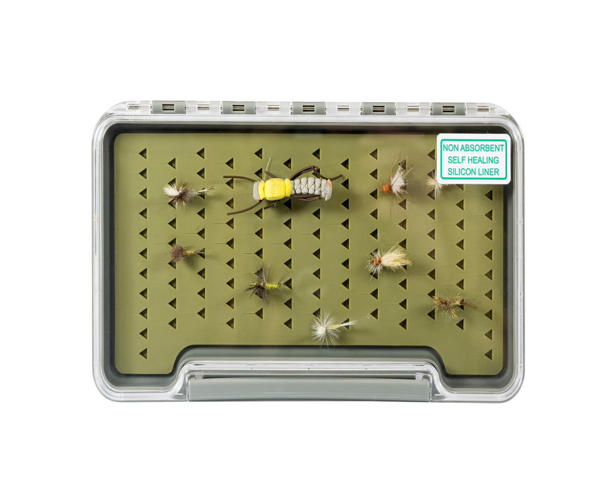 These slim fly boxes feature a silicon liner that is more durable than standard foam and does not absorb odor. Waterproof.