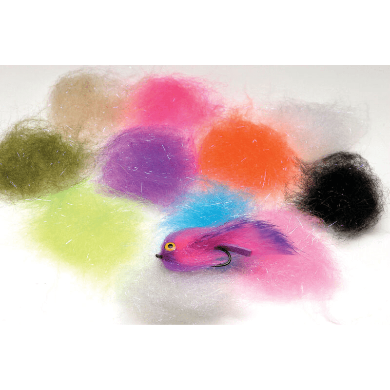 A unique custom mix that we have developed along with fly designer Greg Senyo. It can be used as wings, collars, dubbed bodies or veiled-wool style heads. It is a mix of Ice Dub and 1-1/2 inch acrylic staple fiber. A must for Salmon, Steelhead and saltwater patterns,