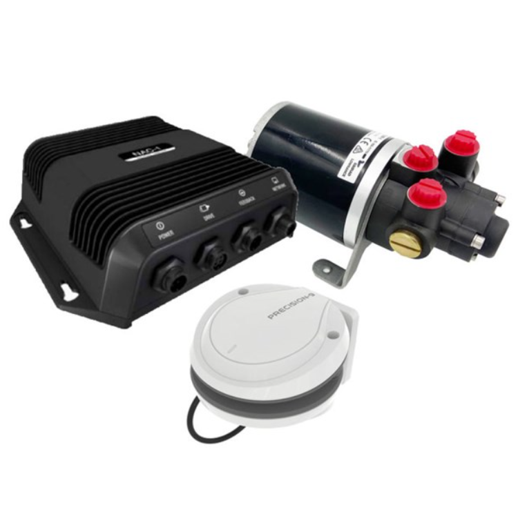NAC-1 Precision Hydraulic Autopilot pack: Includes Precision-9 Heading Sensor, NAC-1 Autopilot Computer, PUMP-1 (MkII) Hydraulic Pump – 0.8L reversible hydraulic pump, Standby-Auto button and Micro-C network components.