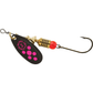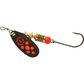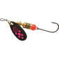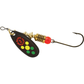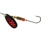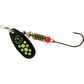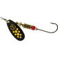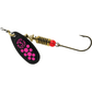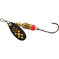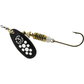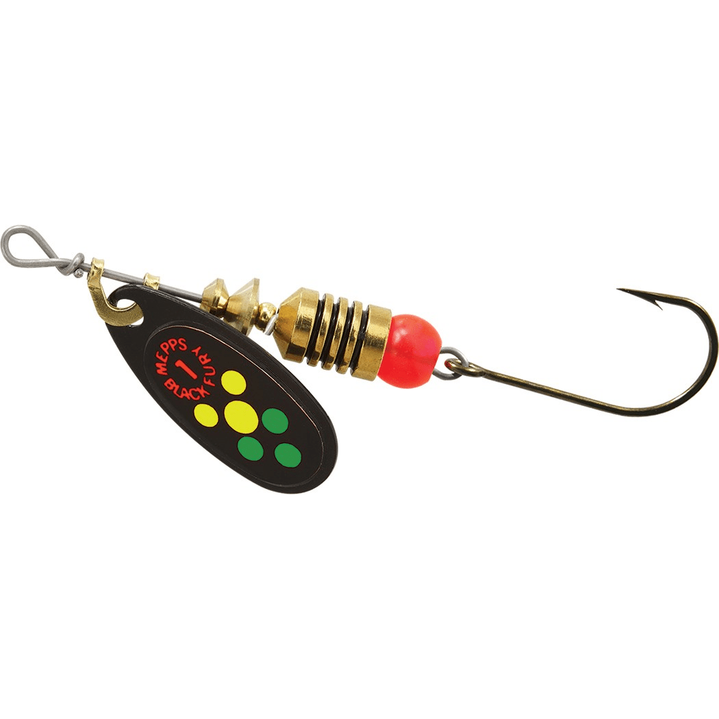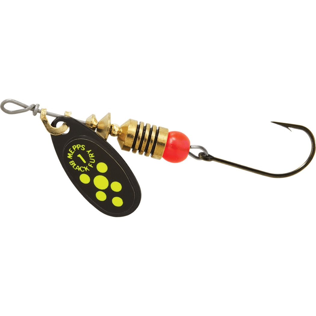 The Black Fury with a plain treble hook is one of the great all-time Mepps spinners. The special Black Fury blade spins closer to the body than the classic Aglia blade so it easily fishes shallow to mid-depths. All Mepps Black Furys are excellent low light (early morning, evening or overcast) spinners as well as a perfect choice for sunny days when contrast with the brightness of the water, weeds and structure is needed. Whether you select a plain or dress Black Fury is strictly personal preference. Most panfish and bass fishermen prefer dressed spinners, while most trout and salmon fishermen prefer plain treble hook Black Furys. Either is very effective at catching a wide variety of freshwater game fish. Largemouth bass, smallmouth bass and walleye fishermen should also consider a Black Fury Combo.