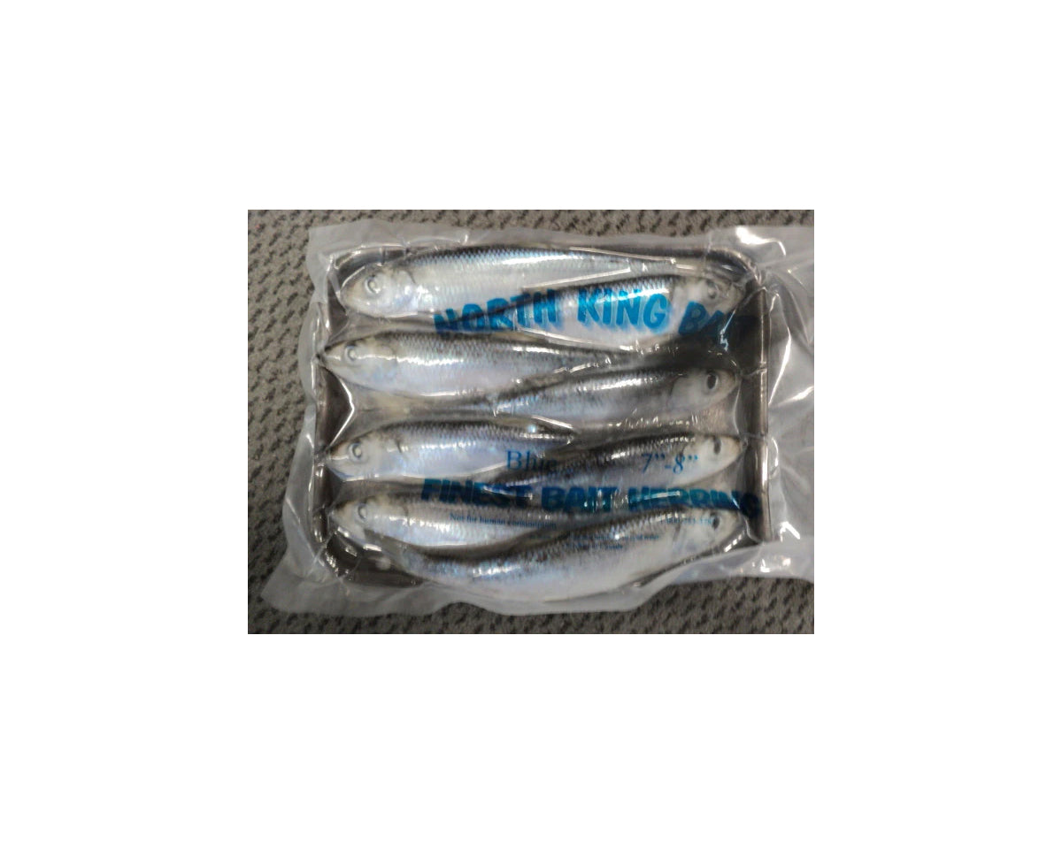 These Rhys Davis herring, size medium, are 7-8 inches long and there are 8 on a tray. Also known as size "blue", these herring fit well into a Rhys Davis Super Herring teaser head. They are also the preferred size for those looking to cut plug their bait. Don't forget to pick up some of our Guide's Choice Fine Crush Brining Salt to firm up your baits prior to fishing.