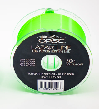 OPST Pure Skagit Lazar Line epitomizes everything people love about monofilament running lines: slickness, easy shooting, and thinness. Even better, it lacks memory, the main drawback common in mono. If you like to make a cast and then kick back and enjoy the scenery while your running line is streaming out, maybe taking a bite of your sandwich as you achieve more distance than ever before, Lazar Line is for you. This ultra-thin, extremely slick running line will shock you with how little memory it has. We still laugh when we take strips of line off of our reels because we can't believe how good it is, even after years of use. A new spool will have some memory, but if you stretch the line and, even better, pull it through your fingers, you will see that memory disappears. Lazar Line is a low-stretch monofilament, and thanks to that and to its thin diameter, it ties neat and strong knots. We have tested it in both hot and cold conditions and have found it outstanding at any temperature. In cold conditions, initial line stretching will be necessary, but performance will