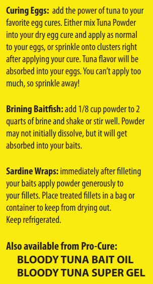 Pure bloody tuna powder with amino acids that drive salmon crazy. 100 times stronger than tuna bellies-this stuff is RED HOT! Add to your favorite egg cures or herring brines. Sprinkle on sardine fillets and let marinate before wrapping plugs (no more begging for tuna bellies!) Marinate already cured eggs to harness the power of tuna.