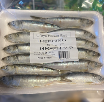 These Rhys Davis herring, size small, are 6-7 inches long and there are 10-12 on a tray. Also known as size "green", these herring fit well into a Rhys Davis Bullet Roll teaser head. They can also be cut plugged and are a great choice when the fish are feeding on smaller bait. Don't forget to pick up some of our Guide's Choice Fine Crush Brining Salt to firm up your baits prior to fishing.