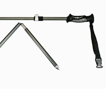 Collapsible aluminum wading staff locks open with adjustable height from 49-54 inches. Includes belt sheath and wrist lanyard. Aluminum tip.